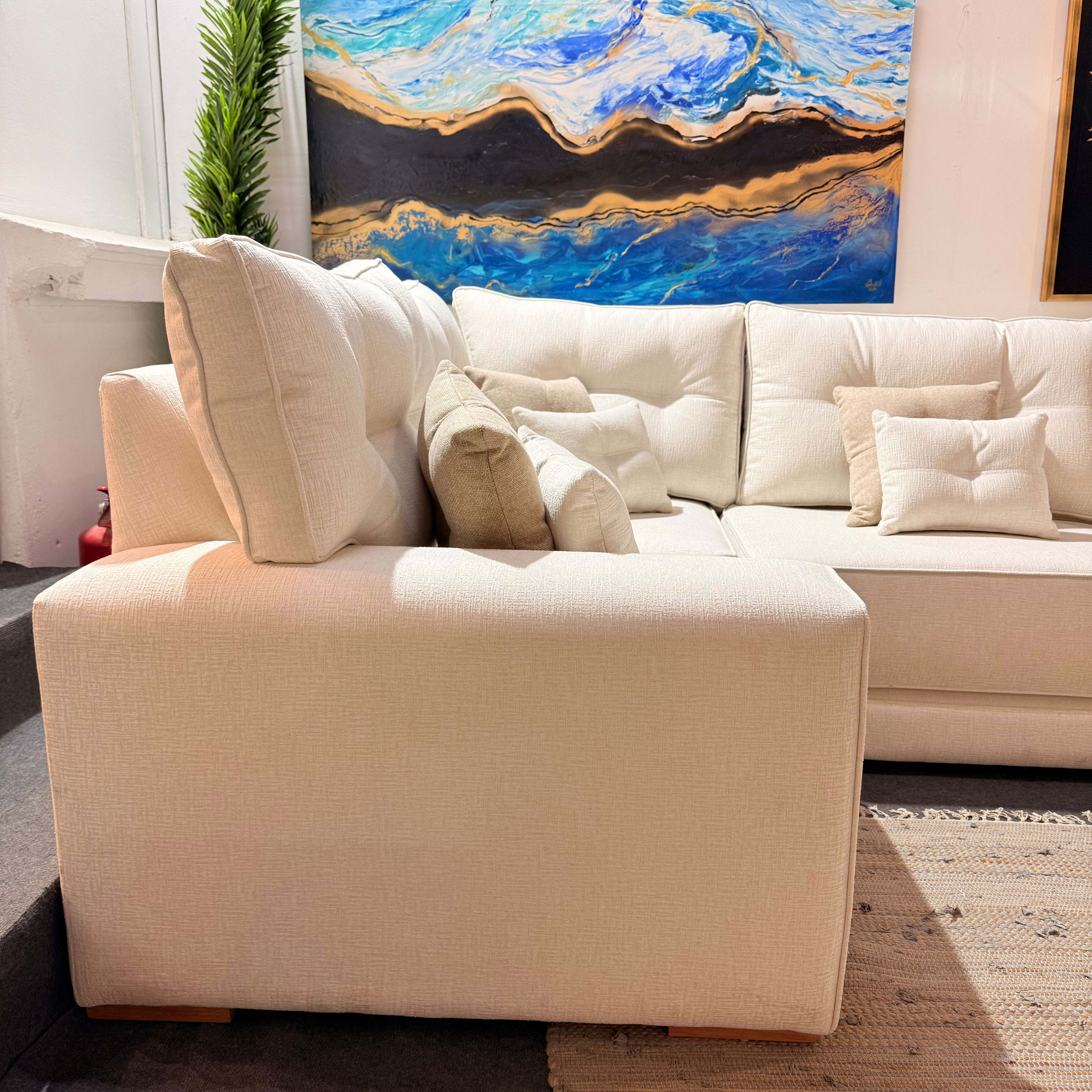Este sofá combina una estructura robusta y bien definida con un tapiz premium de alto gramaje, que aporta sofisticación y durabilidad. Su presencia imponente y textura suave transforman cualquier espacio en un ambiente cálido, elegante y lleno de carácter.